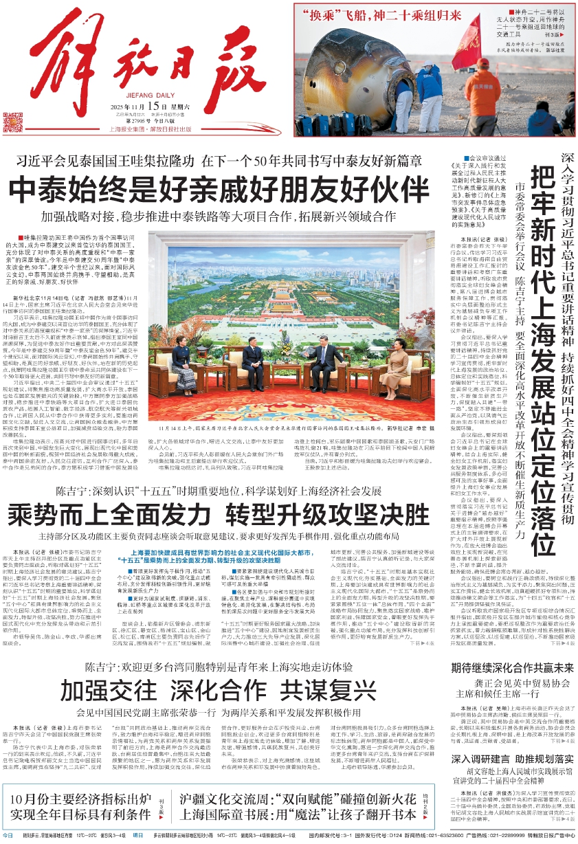 陈吉宁说,“十五五”时期是基本实现社会主义现代化夯实基础、全面发力的关键时期。上海要加快建成具有世界影响力的社会主义现代化国际大都市,“十五五”是乘势而上的全面发力期、转型升级的攻坚决胜期。要紧紧围绕“五位一体”总体布局、“四个全面”战略布局协同发力。聚焦落实国家战略、维护国家利益、保障国家安全,着眼更好发挥先手棋作用,推动“五个中心”建设取得新的突破,强化重点功能布局,充分发挥科技创新引领作用,更好培育发展新质生产力。 下转4版(上接第1版) 严格落实城市总体规划要求,优化城市发展空间布局,更好巩固拓展优势、破除瓶颈制约、补强短板弱项,打好城市转型升级攻坚战。
