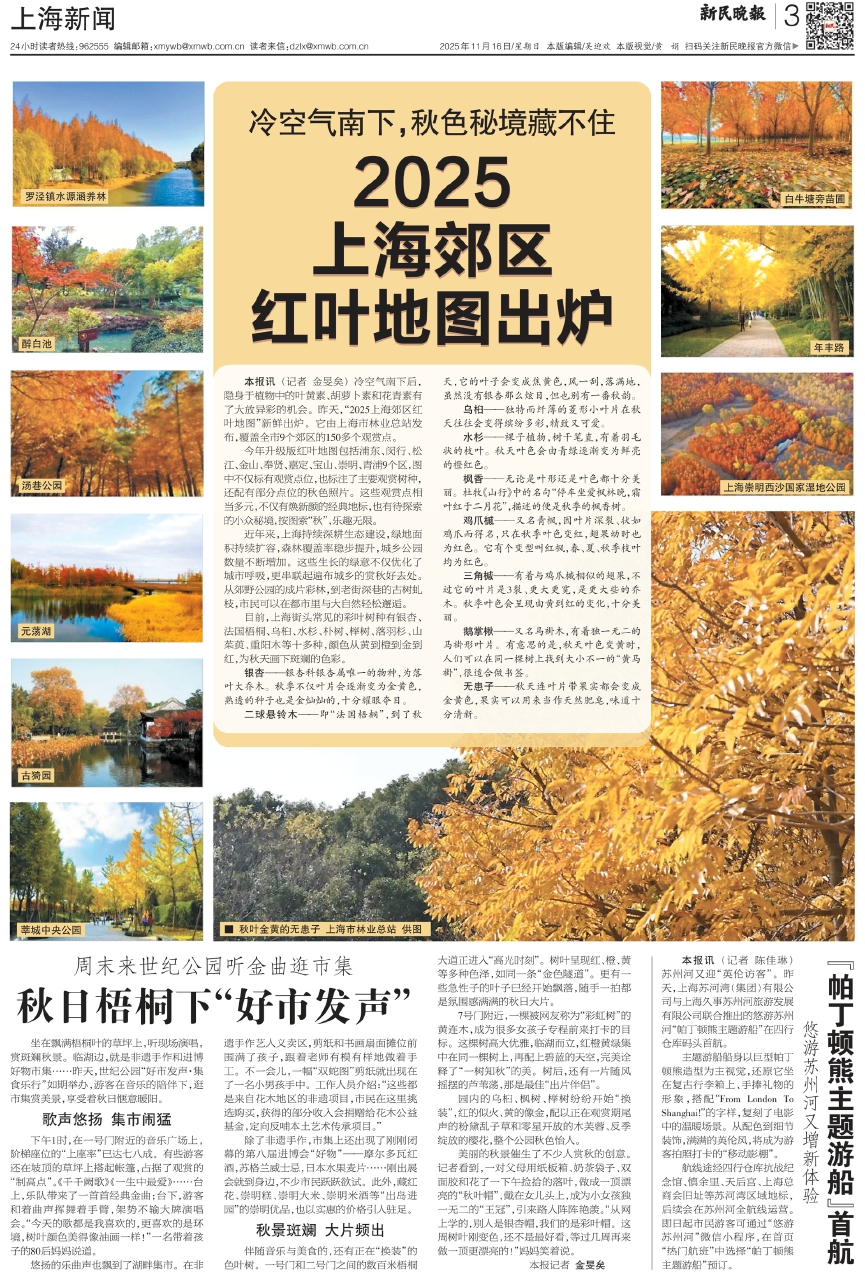 伴随音乐与美食的,还有正在“换装”的色叶树。一号门和二号门之间的数百米梧桐大道正进入“高光时刻”。树叶呈现红、橙、黄等多种色泽,如同一条“金色隧道”。更有一些急性子的叶子已经开始飘落,随手一拍都是氛围感满满的秋日大片。
