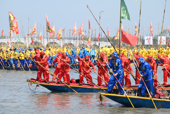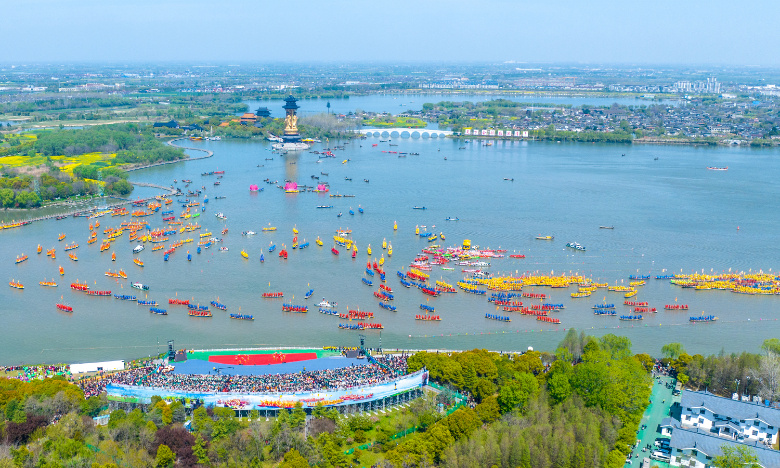 交汇点讯 堰上莺歌燕舞,湖畔桃红柳绿,一年中最美好的时节,泰州姜堰溱湖湿地如期上演“世界最大的水上庙会”。4月8日,第十六届中国湿地生态旅游节暨2023中国泰州姜堰溱潼会船节激情开幕,五百多条各式各样的船只和上万名会船选手飞篙走桨,弄潮击浪,演绎历久弥新的民俗画卷。现场数万名中外嘉宾、游客共赏湿地风情,见证“千篙万桨闹溱湖 百舸争流逐春潮”的壮观景象。