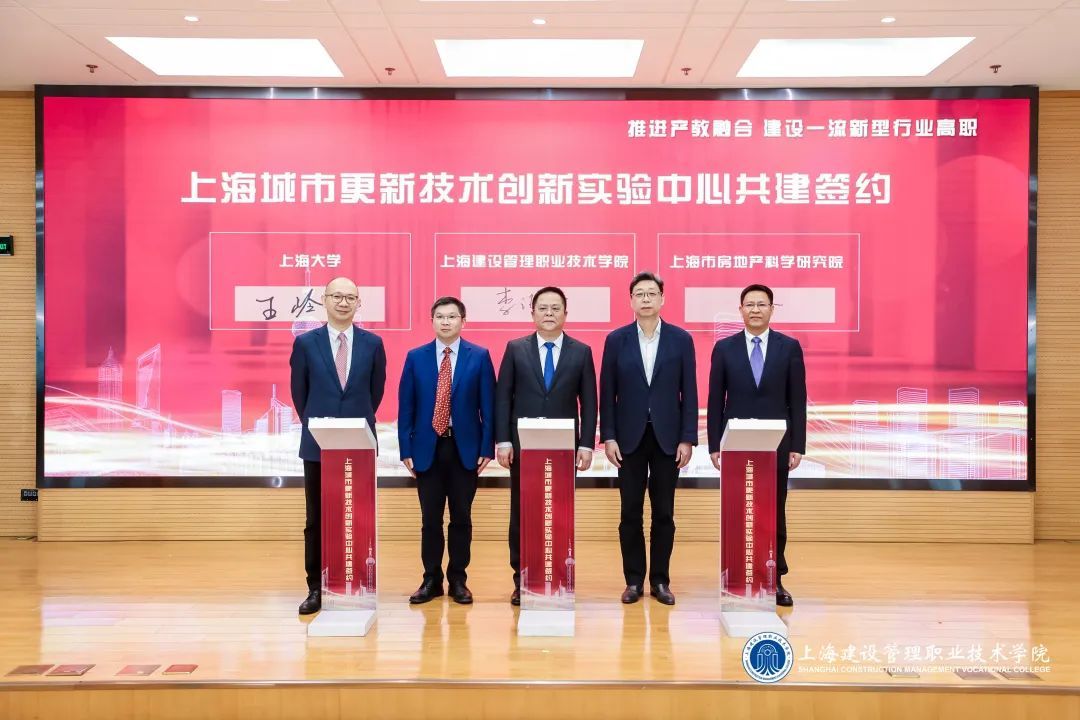 在市住房城乡建设管理委总工程师刘千伟、上海大学副校长王从春见证下,上海大学党政办副主任王岭山、市房科院院长严荣、上海建管职院院长李海伟签约共建“上海城市更新技术创新实验中心”。