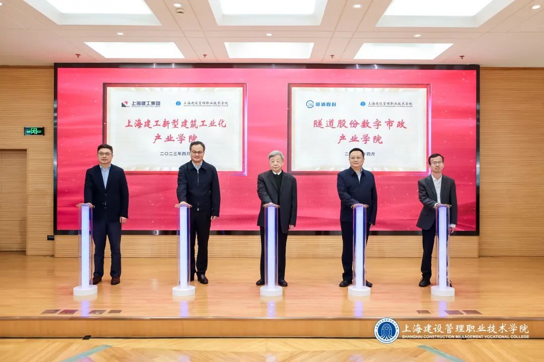 揭牌仪式上,中国工程院院士林元培与住建部人事司二级巡视员路明,市住房城乡建设管理委副主任、市房管局局长王桢,建工集团总工程师陈晓明,隧道股份集团副总裁王志华共同见证“上海建工新型建筑工业化产业学院”“隧道股份数字市政产业学院”成立。