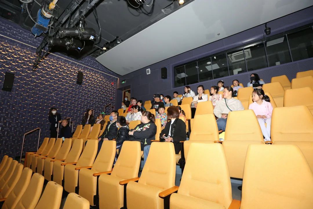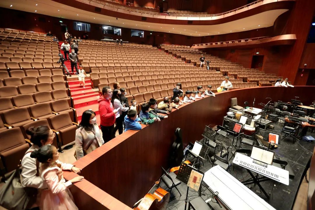 随后,大家一起来到位于地下室的小剧场和即将上演越剧《红楼梦》的大剧场进行参观。工作人员告诉小朋友们,小剧场顶上海浪型的设计是为了有效减少声音外溢,确保演出效果良好;剧场最靠近舞台的“大坑”是给乐队老师们演奏的地方,一场大戏,除了台上演员们的精彩表演,也离不开乐队老师们精妙的配乐伴奏。