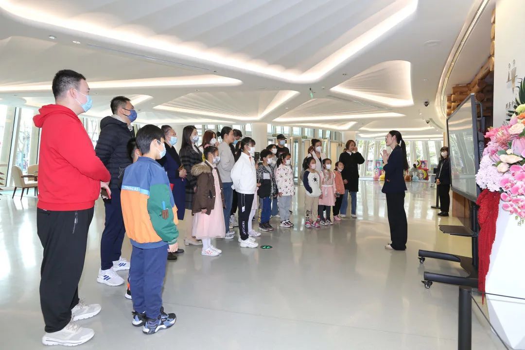 接下来,工作人员带领大家参观了位于门口的衣帽间。门口的装饰看似简单,实则是国家一级美术师韩硕老师设计的仿榫卯结构,透露出中华民族传统文化的气息,让小朋友们大为惊叹。