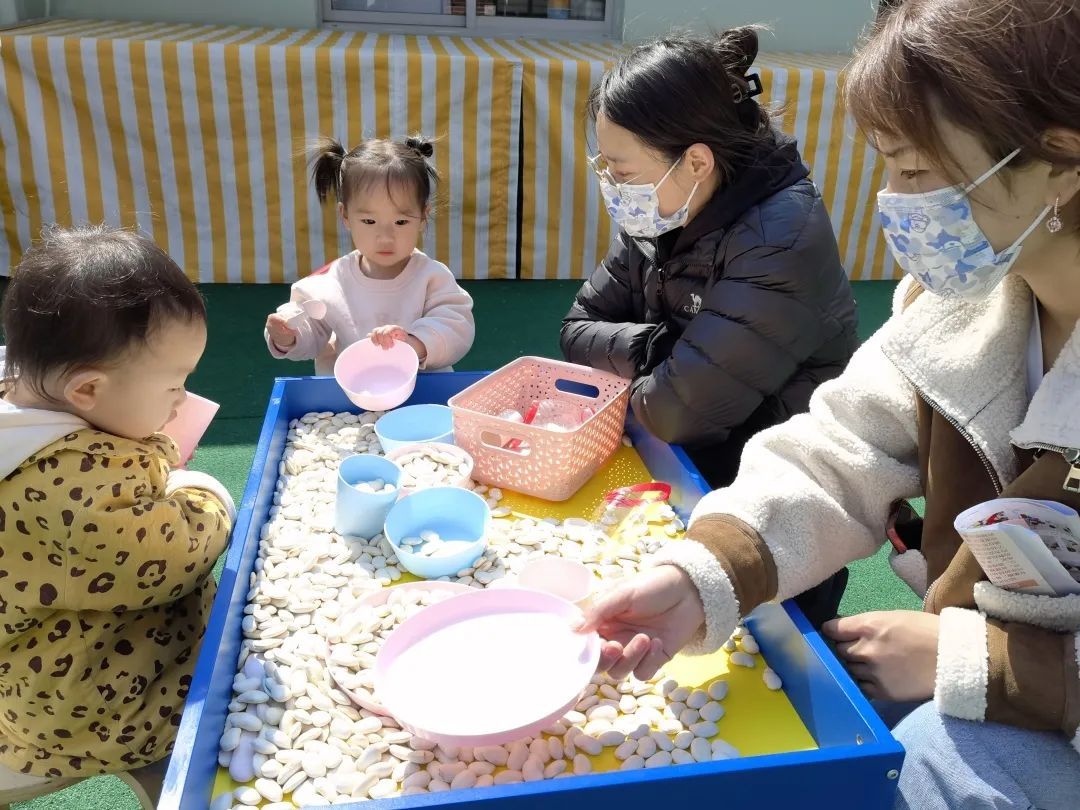 活动现场,老师们提前准备了适合不同年龄段幼儿的游戏项目,让孩子们在玩耍中学习。插花、倒蚕豆、玩滴管、追泡泡、听绘本……3岁以下幼儿注意力集中时间短,各类“玩中学”的游戏活动往往只安排5-10分钟,但每个项目都有特定的目标。