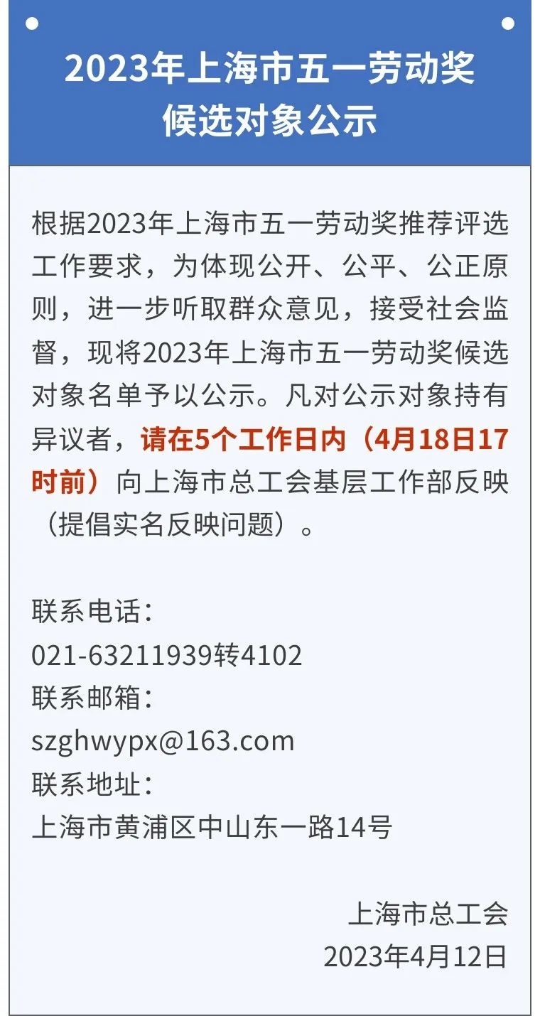 2023年上海市五一劳动奖候选对象公示!有你认识的人吗?