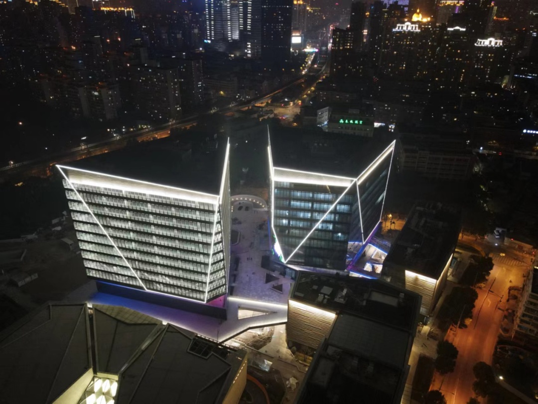 海粟文化广场作为长宁区重要的文化、商业、艺术聚集地,连接着刘海粟美术馆、海粟绿地、天山公园、轻轨等公共场地和交通枢纽,在总体夜景打造中,结合海粟文化广场立面造型,以山石为意,与刘海粟美术馆相呼应,共同构筑起山峦起伏的文化地标。以建筑楼顶为最高亮度,出入口与各节点次之,绿化景观亮度最低,用景观灯光最大程度地将所有区块协调融合在一起。