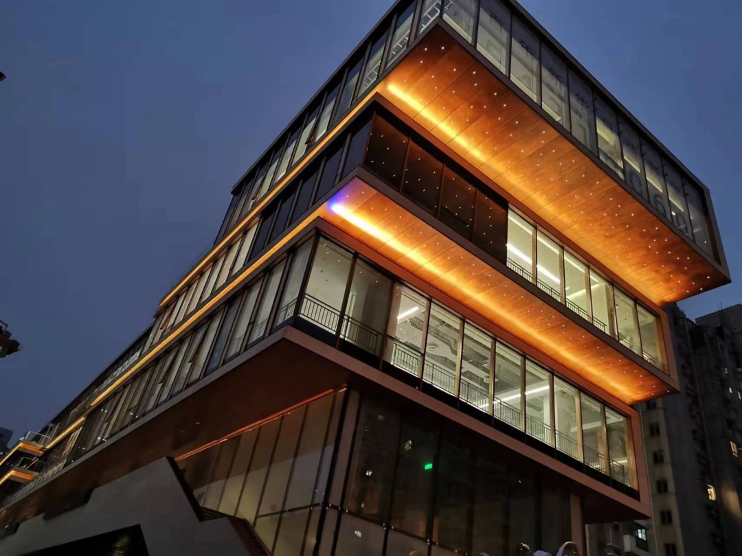 华灯初上,新华道的灯光宁静典雅、稳重大气,建筑整体采用3000K暖色呈现,与周围环境相融。周末节假日开启RGBW调光变色系统增加休闲气氛,与上生·新所交相映衬。建筑西立面面向居民住宅,为减少对周围居民的影响,主要采用了内透光、缝隙照明、窗框和挑檐照明等照明手法,增强了立体感和线条感。