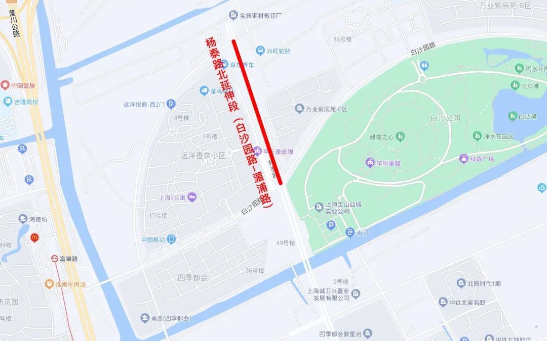 杨泰路北延伸段(白沙园路-湄浦路),位于紫辰苑和远洋悦庭两个居民区中间,长度约470米。杨泰路北延伸路段工程一直备受杨行市民关注,目前该路段的工程已先期竣工,并与北侧湄浦路完成交接。该路段道路项目在建设时充分考虑了未来杨泰路的功能定位,设计了双向四车道,道路十分宽敞。工程人员现正在进行道路绿化铺装工作,杨泰路北延伸段(湄浦路-G1503郊环线)路段建设也已提上议事日程,未来杨泰路将作为重要的城市次干道,连接外环与郊环,并规划穿过郊环线与月浦德都路相连。