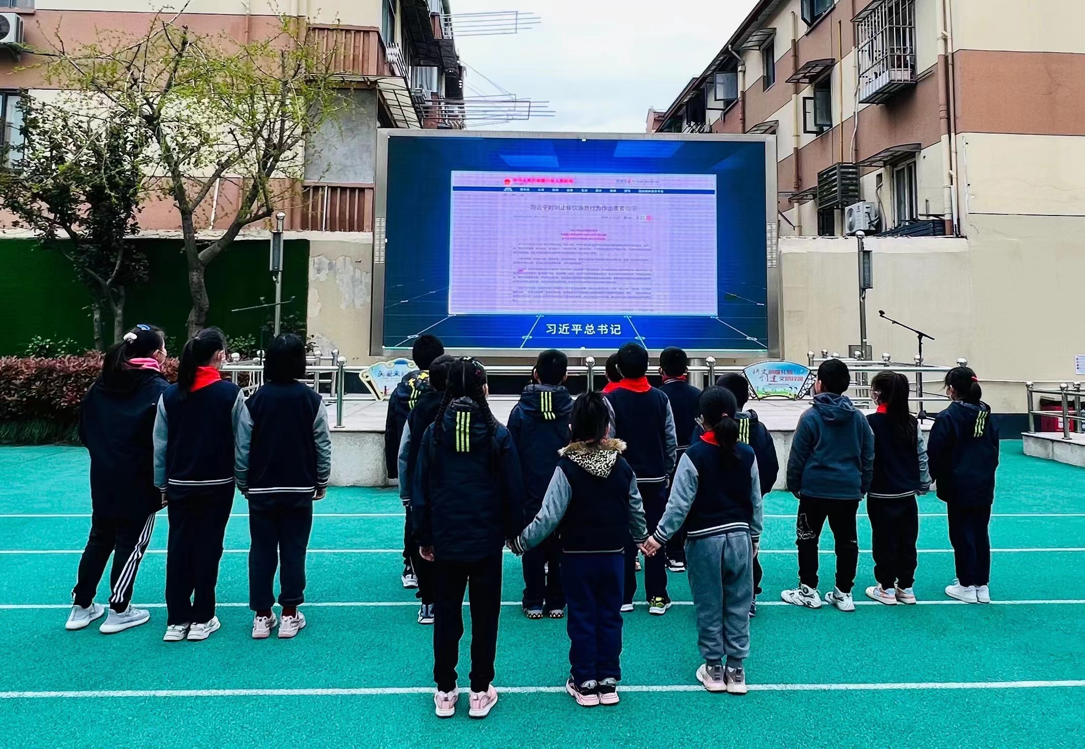 在辖区内中小学校,街道食安办利用各小学课间操时间,在操场大屏幕上播放《制止餐饮浪费,青年在行动》宣传片,学生以此为题材制作手抄报。