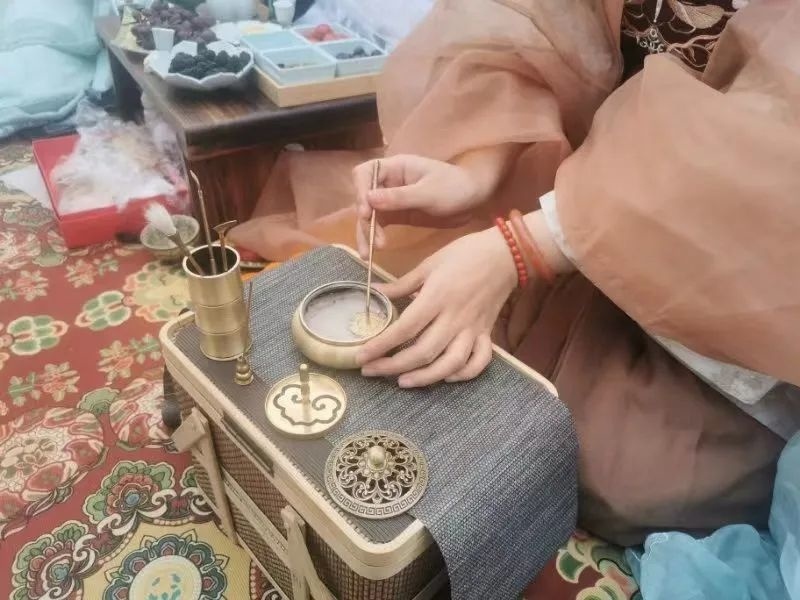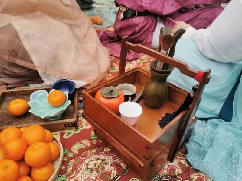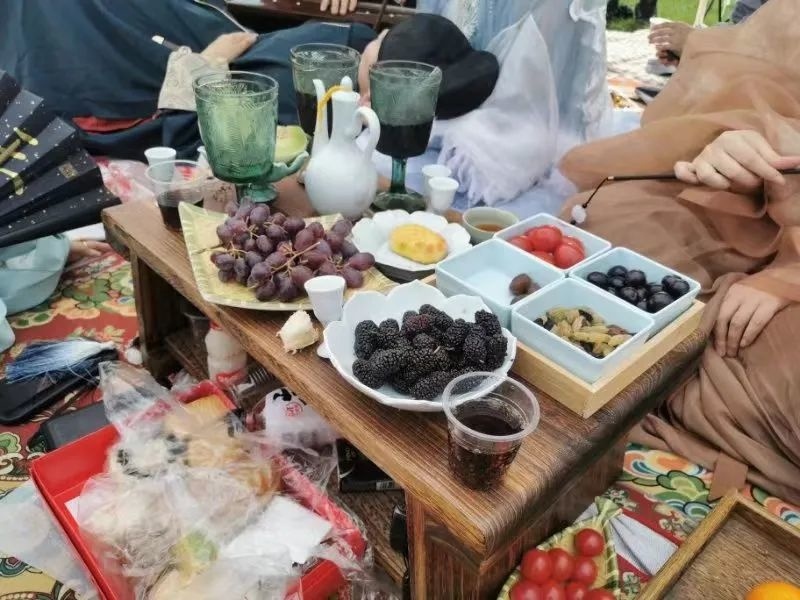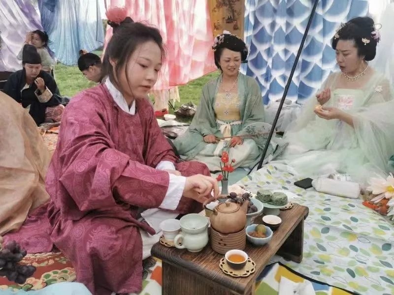 除了郊游赏花,“裙幄宴”的重要环节便是大家以草地为席,四周插上竹竿,将裙子联结起来挂于竹竿,搭饮宴幕帐设宴聚餐。现场,汉服爱好者们在搭好的幕帐内或抚琴焚香、或围炉煮茶,集齐古人几大雅事。丝竹声中,唐代踏青郊游的风俗重现,一场跨越千年的春日之约,让人感受到中国传统文化之美。