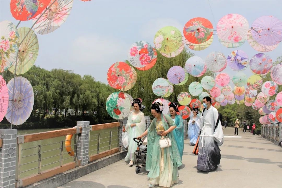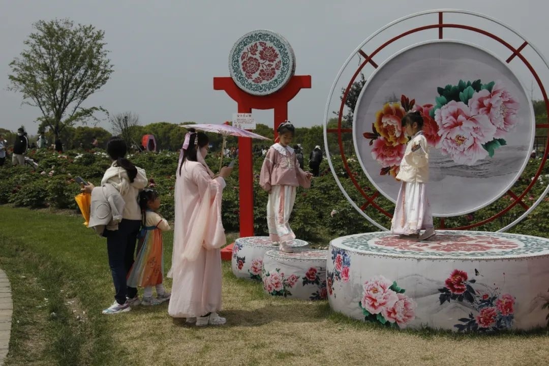 牡丹节游人如织,园内也俨然成为汉服爱好者的乐园。大家不仅带来了非遗鱼灯向游人展示,现场的蹴鞠游戏、身着的唐代服饰以及装扮的唐代妆容,也让传统文化更为鲜活,在日常生活中得到传承。