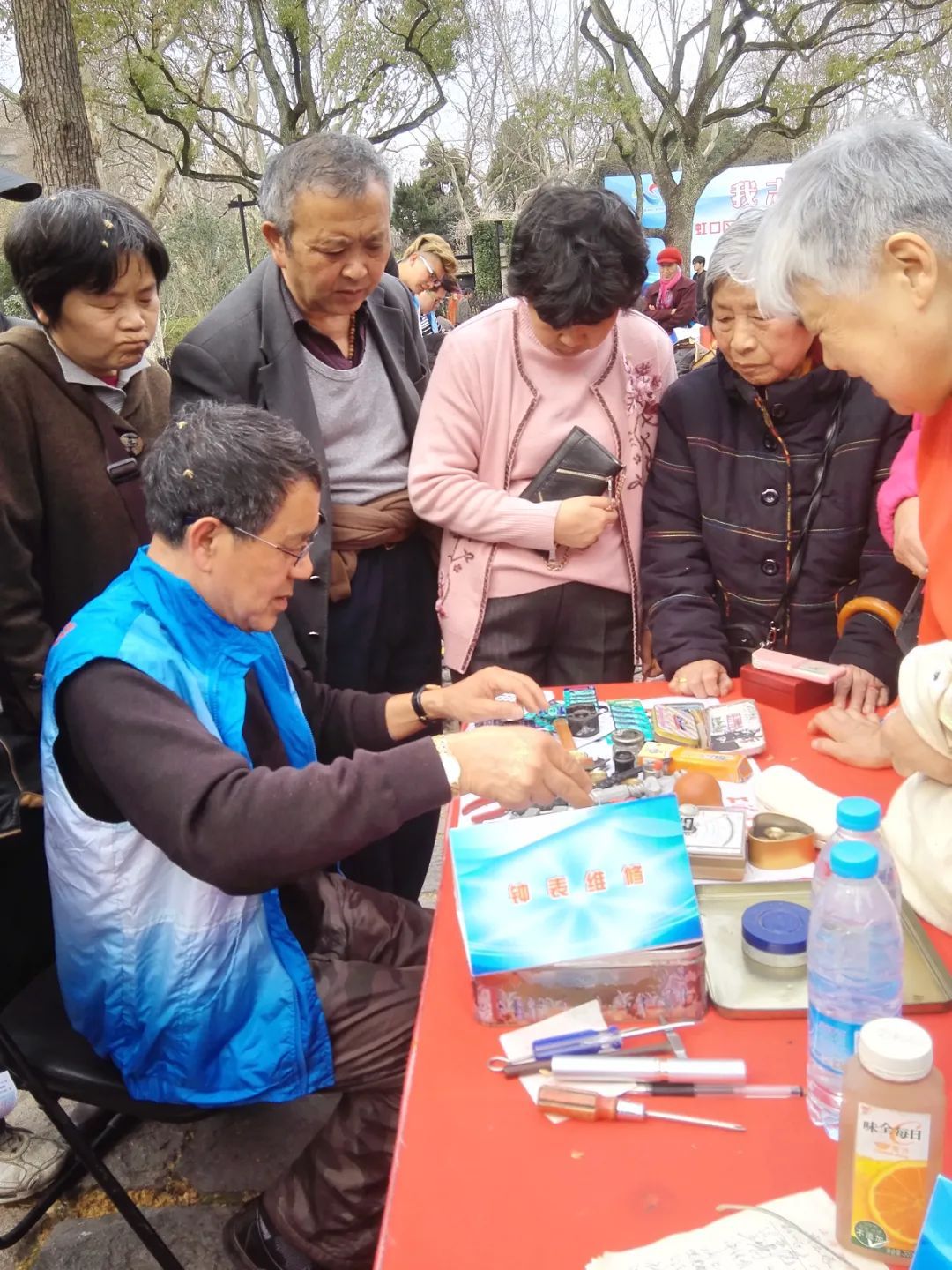 17年前,江福生从企业内退后,正式加入志愿者队伍,开始在社区为居民修表。“我去过的社区太多了,不仅有虹口区内的,还有南京东路街道、淞南镇、定海路街道等等。除了帮居民修手表,老式时钟我也能修!”