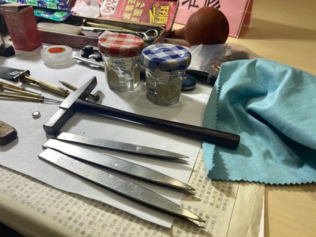 幼年时期,江福生常常呆在父亲身边看着他修表,10来岁时,开始跟着父亲学起了手艺。虽然成年后江福生进入彭浦机器厂工作,但是热心的他也常为厂里员工义务修钟表。“我和弟弟一直跟着父亲学修表,父亲常跟我们说,无论到哪里上班,修表这个手艺不要放弃,多一个手艺傍身,总归有好处的。”