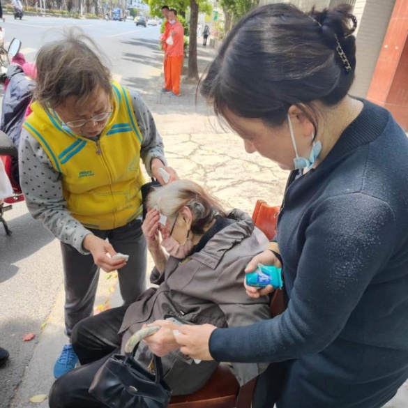 近日,五角场街道正文居委会干部王芳和同事外出就餐时,途经三门路附近,心细的王芳发现有几位居民聚在一起围观议论,几人中间有位白发老人紧紧捂着头部,疼得直弯腰。见状,两人加快脚步上前询问情况。
