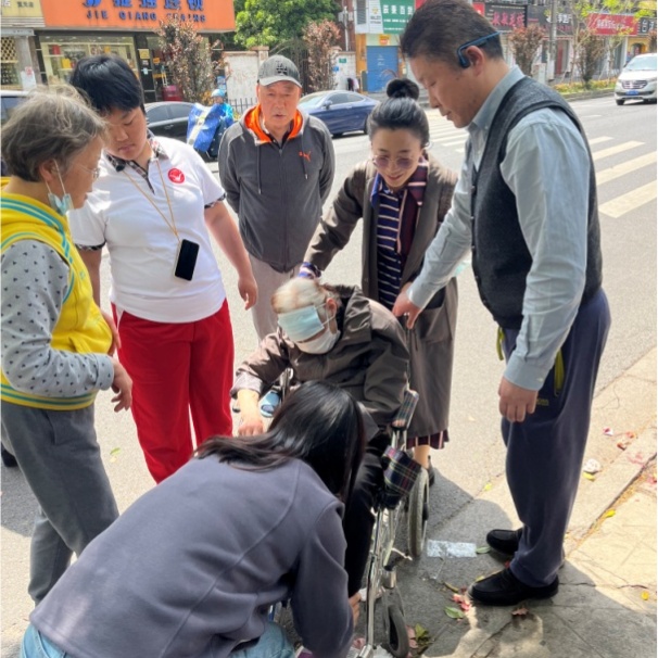 原来老人过马路时不慎摔倒,头部磕到了路边的台阶上,致使左侧太阳穴两处受伤,由于伤口较深,地上留下了两摊血迹,而鲜血还在不断往外溢。王芳赶忙取出随身携带的干、湿纸巾替老人清创,并嘱咐老人先按住伤口。随后询问了老人的住址及家属的联系方式,得知老人住所后,王芳立刻联系了该小区所属吉浦居委会的干部李晨,李晨将情况上报到居委会书记董明处,并前往现场救助老人。