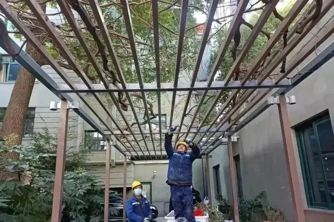 古树编号0899紫藤(二级古树,树龄100年)目前长状态良好,2022年,区绿化市容局联合岳阳医院对其进行了修剪、施肥,并对锈蚀的棚架进行更换,改善了古树生长环境。