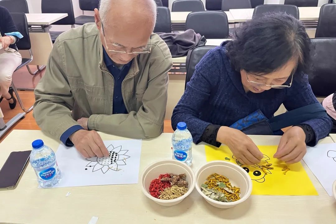 随后在专业药师万瑾的指导下,老干部们通过眼看、手摸、鼻闻、口尝,识别中医药材和它们的功效。老干部们充分发挥中药药材天然的色彩和形态各异的特点,创作出了一幅幅妙趣横生的中药材手工贴画。