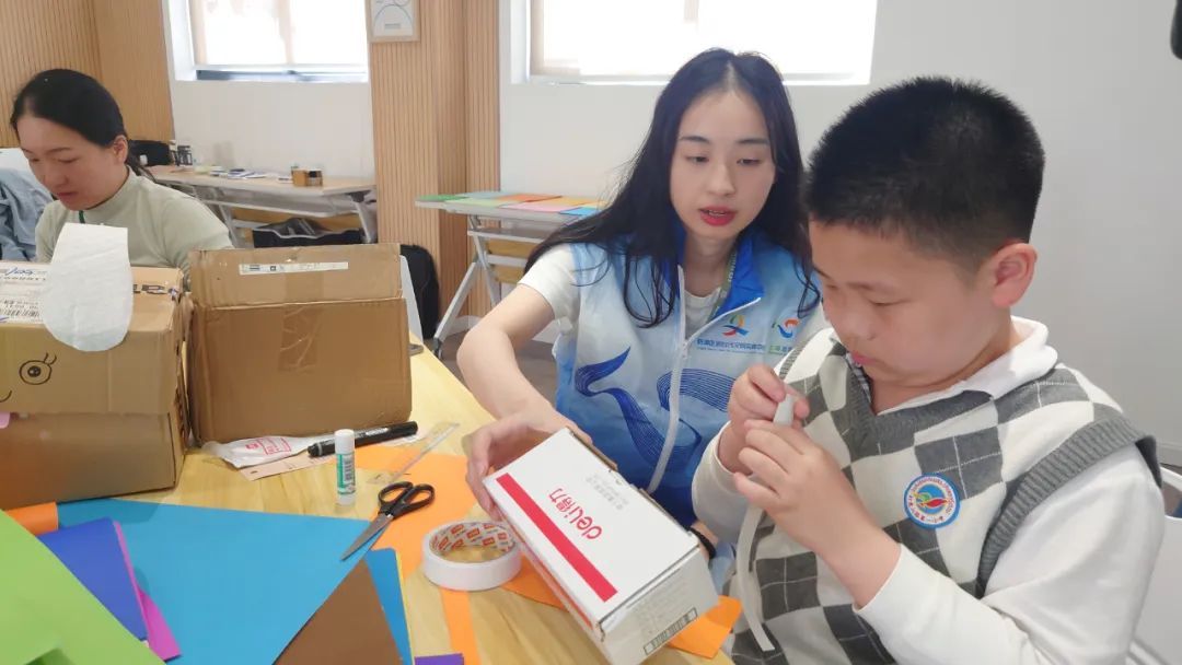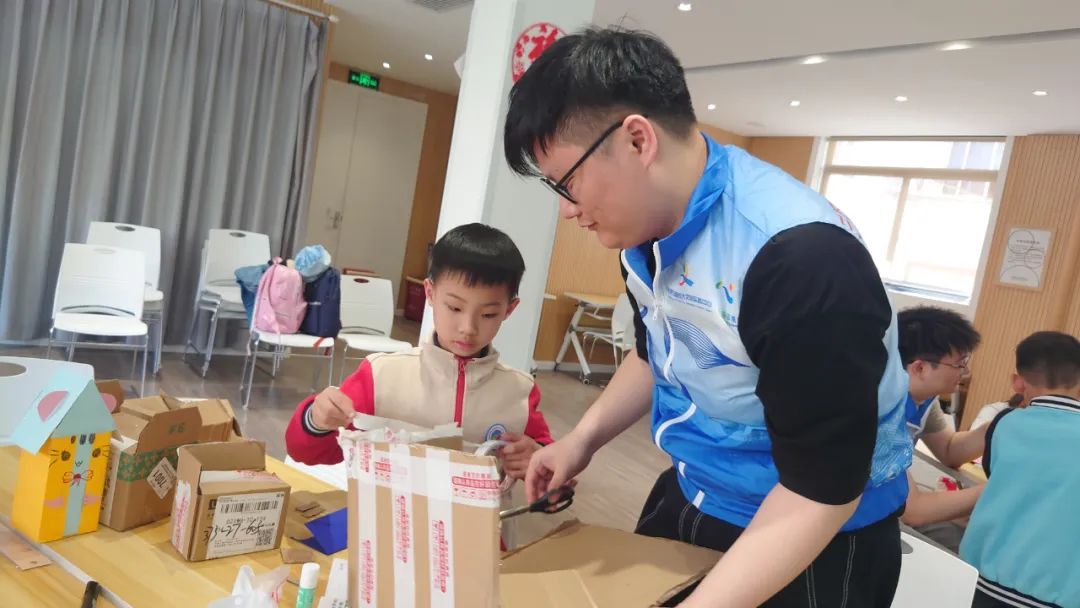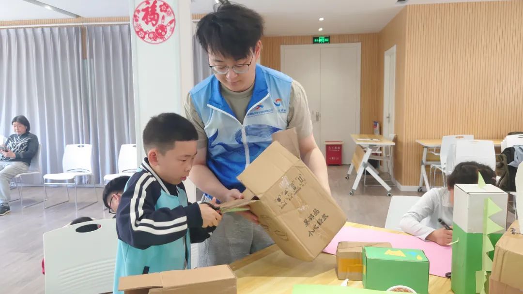 为了加深小朋友对低碳生活的理解,在介绍了碳中和,并讲述了低碳环保的行为要点后,老师们还拿出了生活中常见的快递纸箱,带小朋友们一起“废物利用”。