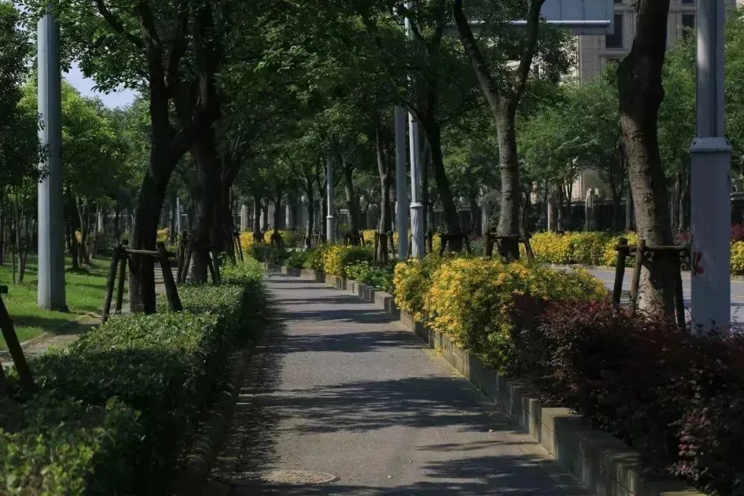 新江湾城绿道郁郁葱葱,满目苍翠,隔绝车水马龙的喧嚣,让静谧流淌,充满轻快的春日气息。