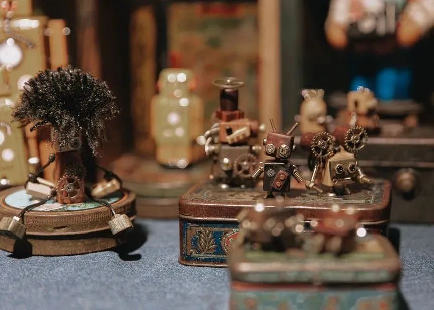 有的摊主利用废弃的金属零件为创作素材,不焊接、不黏贴,制造出机械模型;有的摊主把拾荒得来的废弃物,再加工成摆件;有的摊主以木头为材料,制作木质机械;有的摊主则带来自创的艺术玩偶品牌……