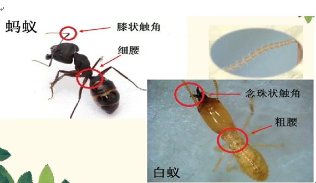 它和蚂蚁是完全不同的两个物种。从长相上来区分,白蚁是白色或黄白色,蚂蚁是黑色或褐色;从触角来看,白蚁是念珠状的,而蚂蚁的触角是膝状的;从体形来看,白蚁是“水桶腰”,而蚂蚁则是“小蛮腰”。