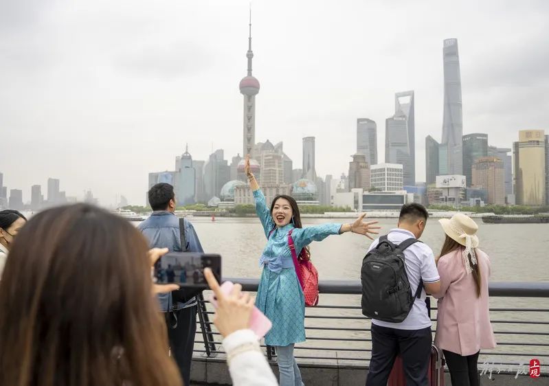 “人多没事啊,只要放假就开心!”从内蒙古来沪游玩的李女士(蓝色外衣)在外滩观景平台张开双臂与背后的陆家嘴留影,享受假日时光。“外滩人多也要来呀,比预想的好多了,人多但不堵,从浦东下飞机乘地铁到外滩,全程也就一个多小时。”