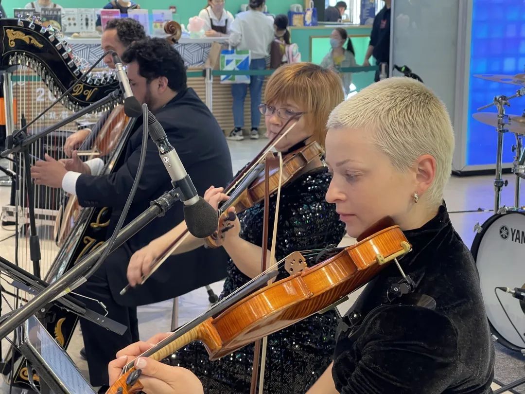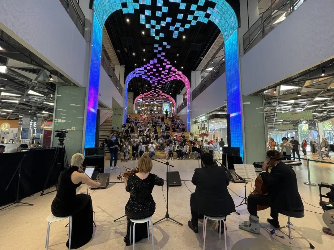 在二座中庭,Diego竖琴弦乐四重奏则为市民带来更为宁静的聆听体验。四位来自不同国家和地区的音乐家,用一曲《蓝色多瑙河》叩开了听众们的心房。