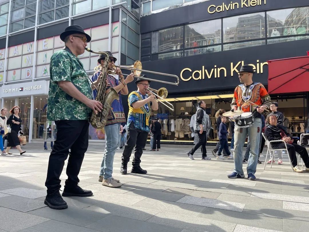 在悠然的行进中,长号、萨克斯和架子鼓分别奏出了《Despacito》《月亮代表我的心》等中外名曲,引来广场上众多市民的驻足。