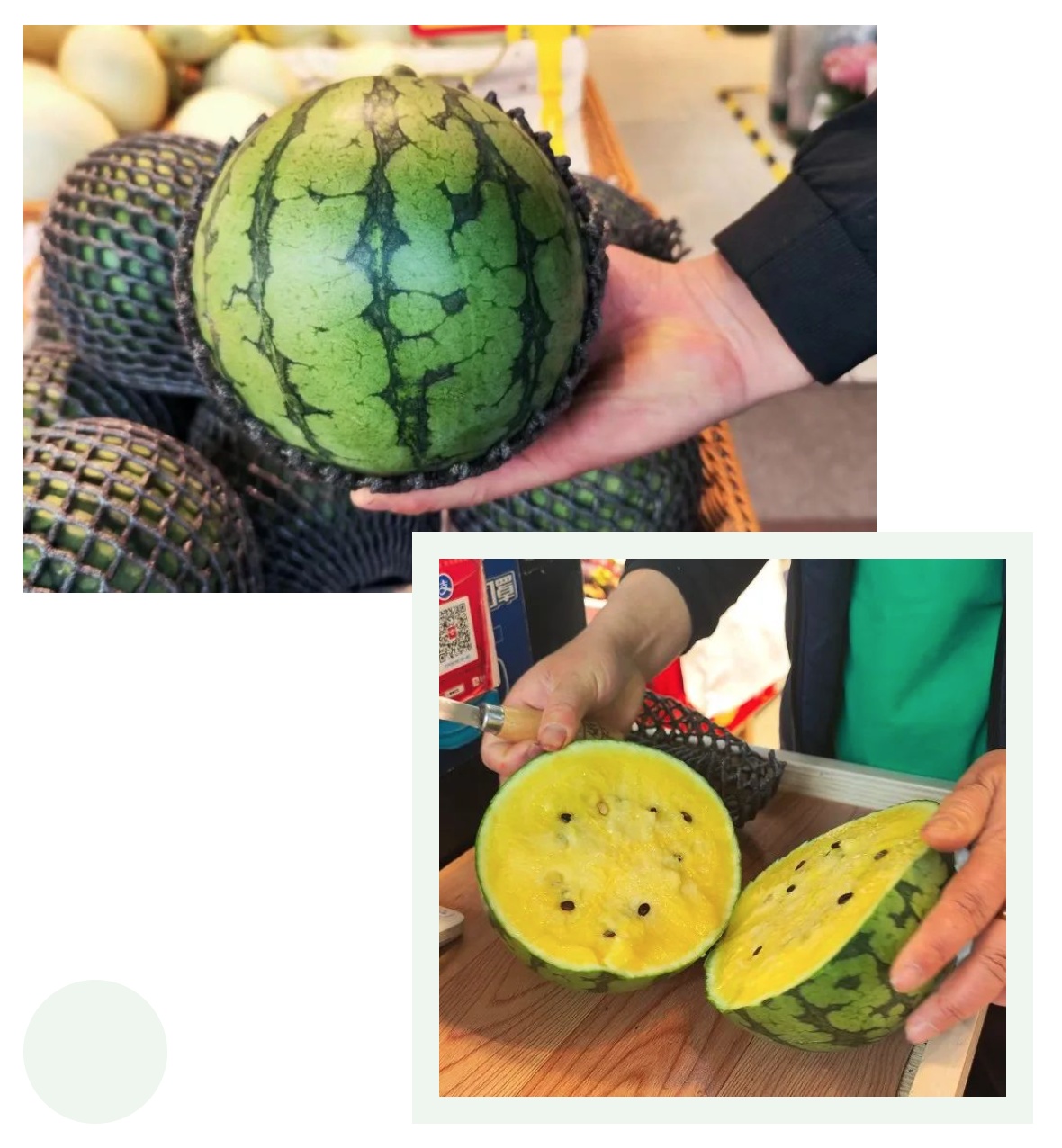 据水果摊主介绍,朱先生购买的是冰淇淋西瓜,也是近几年来比较受欢迎的新品种,有上市早、个头小、瓜皮薄、汁水充盈等特点,“都是头茬瓜,别看个头小,保熟!”
