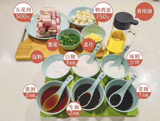 五花肉500g,鹌鹑蛋150g,葱花、姜片、淀粉、白糖3汤匙,味精少许,黄酒2汤匙,生抽2汤匙,老抽1汤匙。