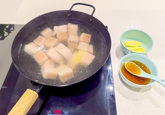 清水煮沸,加入姜片、黄酒、五花肉块,待水再次煮沸后捞出血沫,将肉捞出备用。