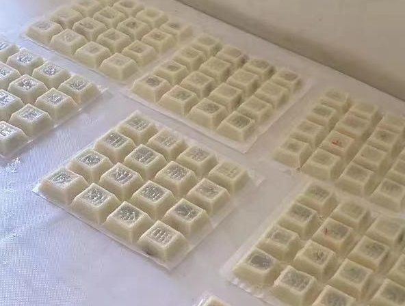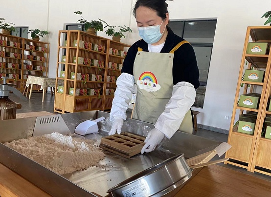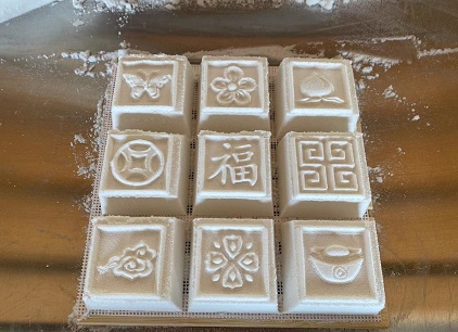在金花的指导下,小松按部就班尝试了一番,不过几分钟便成功了。印刻着祝福语的软糕方方正正,别样可爱,让人迫不及待想看到它蒸熟后的模样,品尝自己亲手制作的非遗美味。