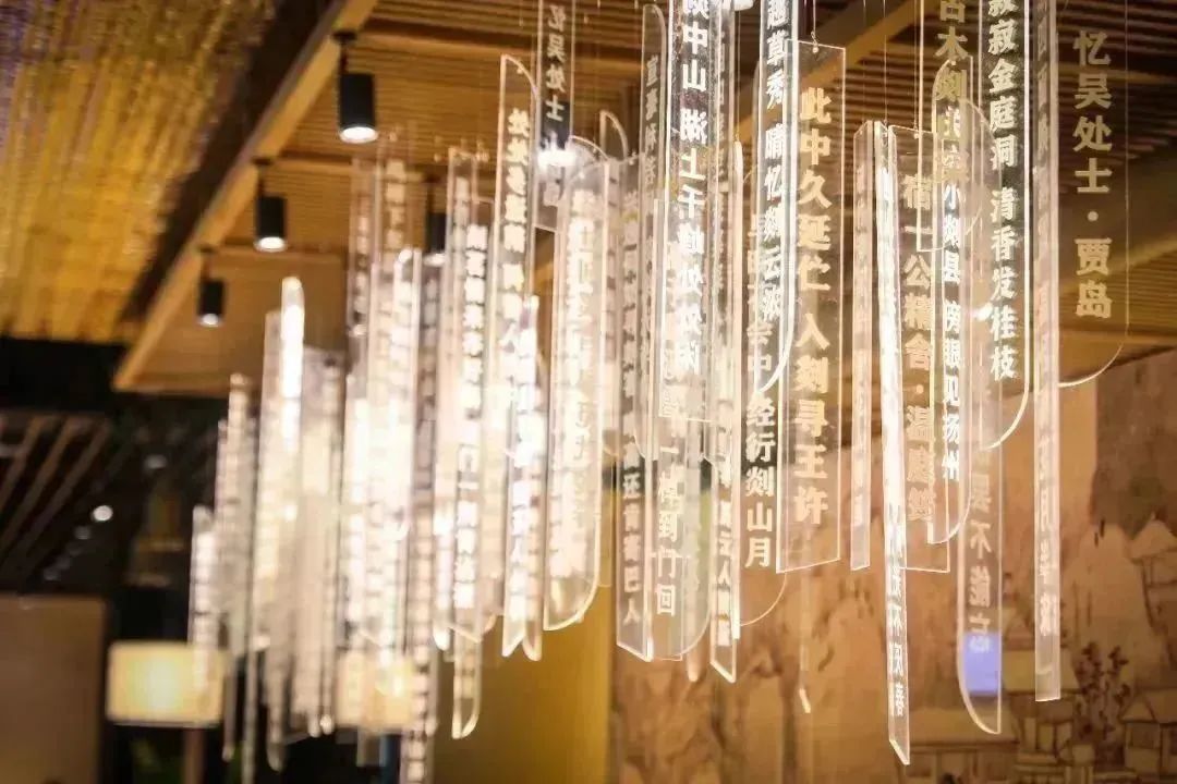 走进书店,原木色系的布置、江南韵味的格局,书店处处彰显环境之美。庭院深深、树影婆娑,沉浸式交互设计所营造的光影效果带来了现代感的诗意。