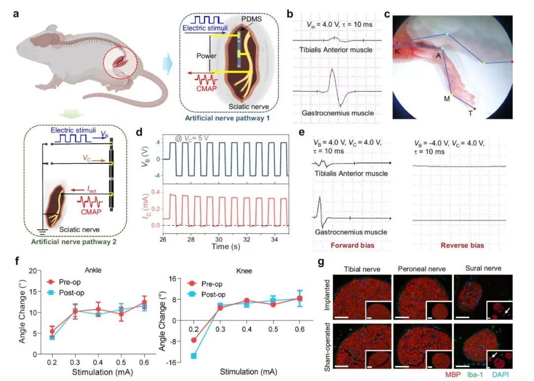 该创新器件可传导神经兴奋,诱发坐骨神经损伤小鼠下肢各关节活动。行为学、电生理及免疫荧光染色显示其长期植入后,神经组织无明显传导功能减退及炎症反应。