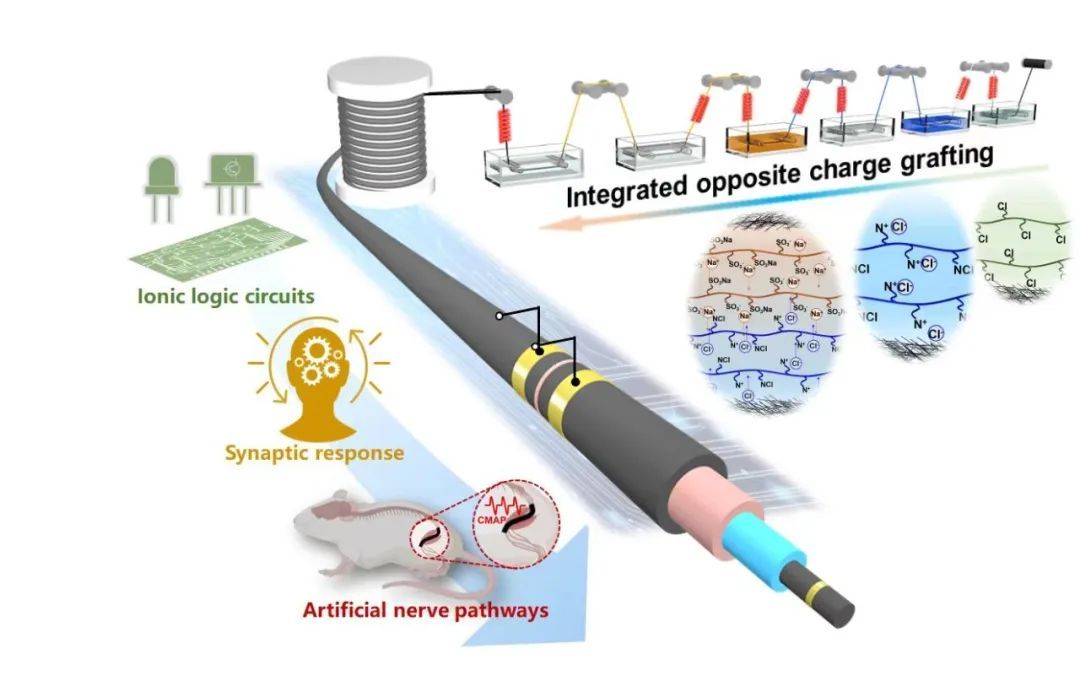 东华大学材料科学王刚教授与复旦大学脑科学研究院张嘉漪教授、复旦大学附属华山医院手外科蒋苏副教授等合作,开发了一种 “离子异质结纤维”,这种创新材料的纤维长度、直径可控、导电性好、化学性质稳定,可用于周围神经损伤后神经的持续电刺激,从而延缓远端肌肉的萎缩,为神经损伤后的患者实现更好的运动功能恢复提供了可能性。此外,其基于离子单向跨膜运输原理的电传导功能与生理状态下神经兴奋的传导机制类似,且有面积充足的神经-器件交界面,同时具备单向传导特性和逻辑运算能力,在优化绝缘封装及改善神经—器件交界面传导性能后,有望替代人体的自体移植神经与损伤神经远端直接桥接,从人工神经通路实现有效神经兴奋的传导,并为植入式多节段神经调控促进肢体精细运动功能恢复带来希望。