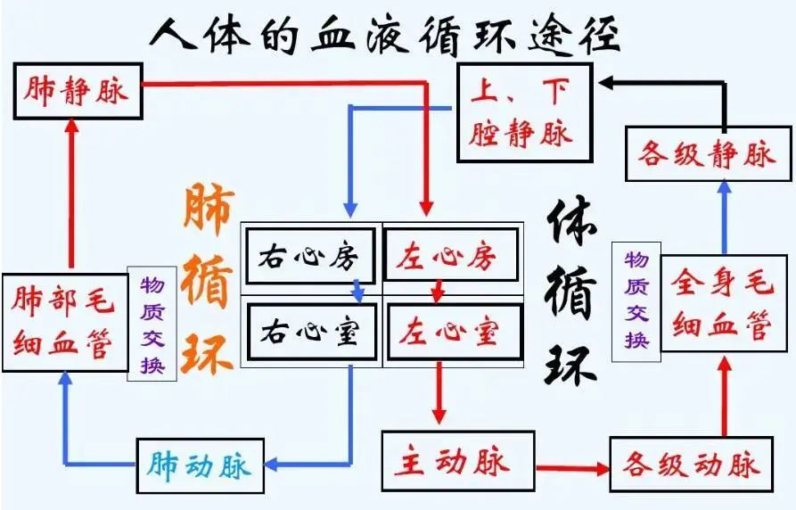 人体血液循环途径有两条,一条是体循环也叫大循环,血液从左心室泵出,通过动脉系统将富含氧的血液送达人体的全身供人体的所需,然后经静脉将代谢后的静脉血液送回右心房。另一条是肺循环也叫小循环,人体代谢后的静脉血由右心房进入右心室,泵出后通过肺动脉流向肺部的血管,通过肺部的毛细血管网,与呼吸入的气体进行气体交换,然后再通过肺静脉将富含氧成分的血液送回左心房。也就是说,两个循环经过右心房→右心室→肺部→左心房→左心室,完成一次血液在心脏和肺部的流动。
