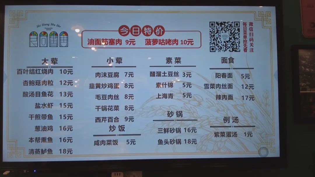 《我汇吃食堂》第七期探店来到了徐家汇街道的一家社区食堂,它有一个非常文艺的名字——食尚书舍。食堂位于南丹东路109号,营业时间为早餐6:30-9:30,午餐10:30-13:30,晚餐16:30-19:30。