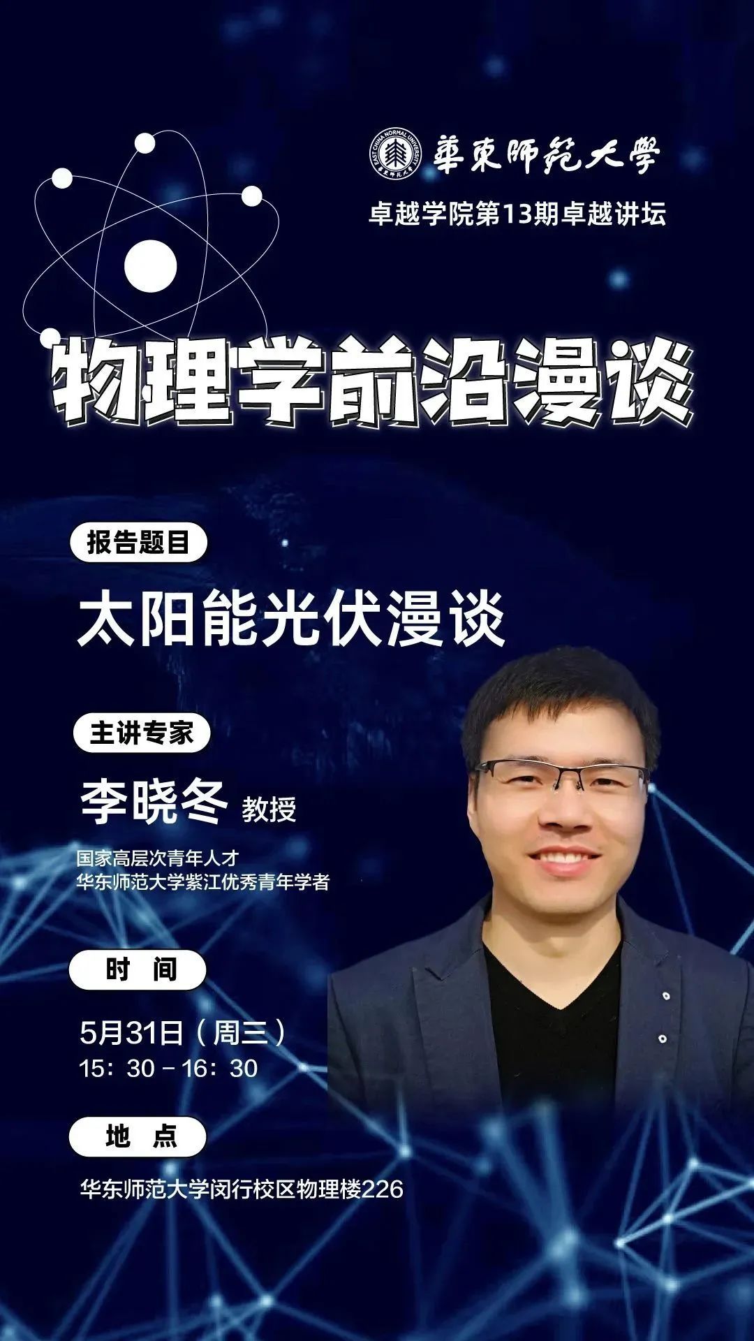 专家简介:李晓冬,教授,博士生导师,国家高层次青年人才,华东师范大学紫江优秀青年学者。致力于钙钛矿电池效率和稳定性研究,在国际上率先实现效率>24%的反向钙钛矿电池,创造当时(2022年)反向钙钛矿电池效率的世界记录。以第一/通讯作者在Science、Sci. Adv.、Nat. Commun.等刊物发表论文60余篇。多次受邀参加美国化学会年会(ACS Fall 2022)、国际光子学和电磁学研究(PIERS)、国际光通信与网络(ICOCN)等国内外专业学术会议并做邀请报告。