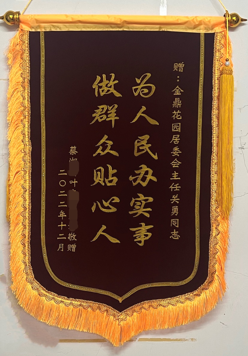 不久前,居民叶阿姨将“为人民办实事,做群众贴心人”的锦旗和感谢信送到了居委会,感谢关勇对其家庭的关怀照顾。