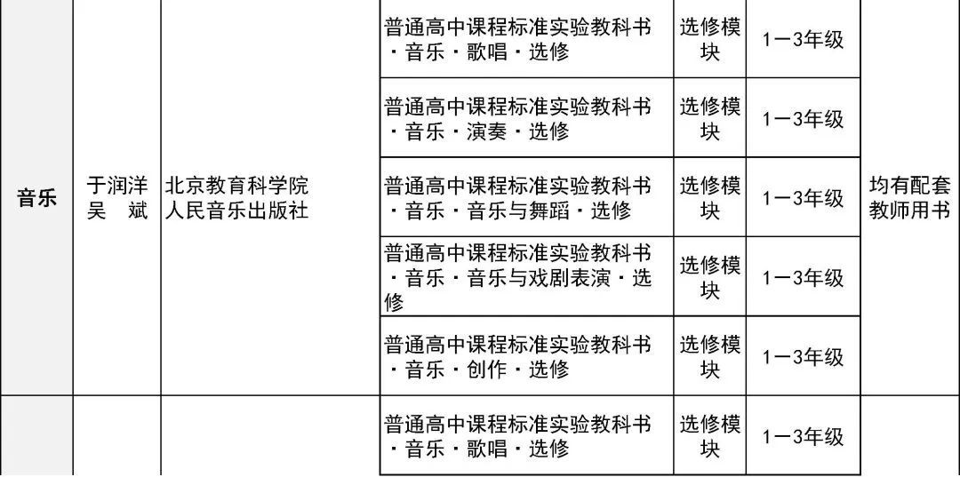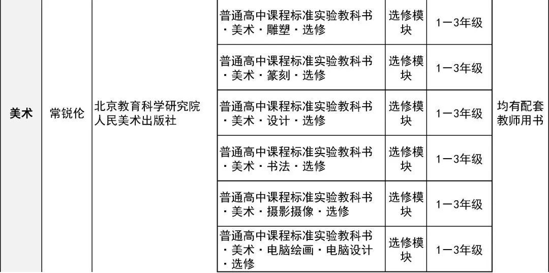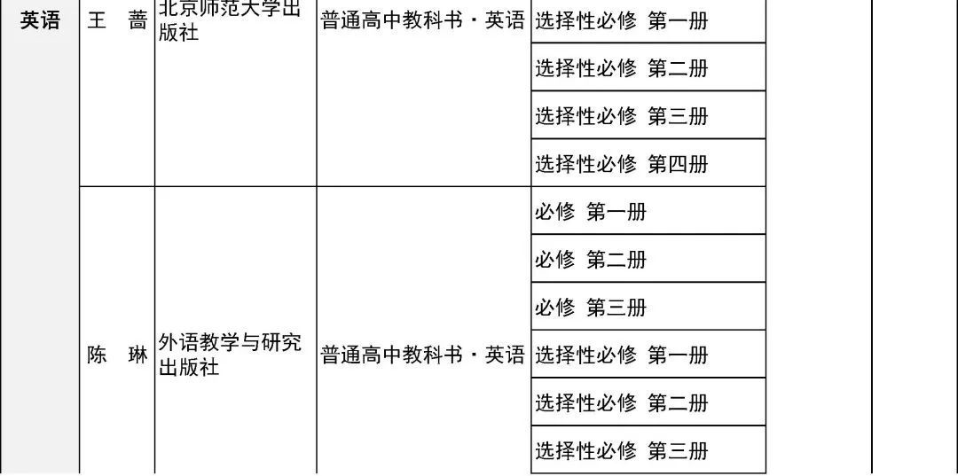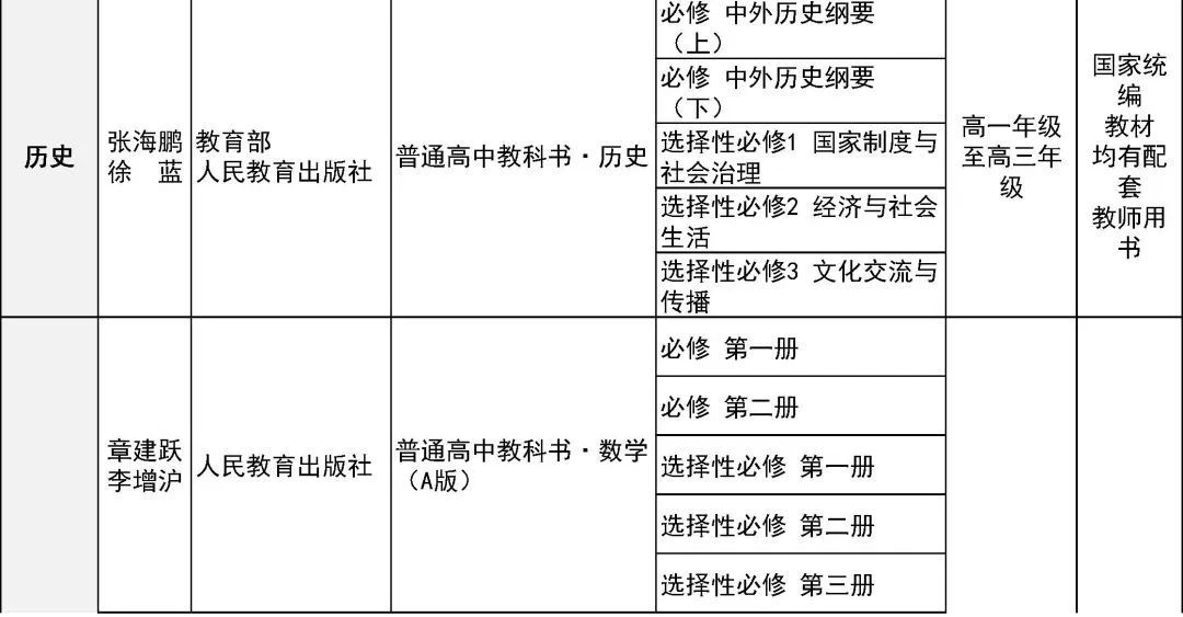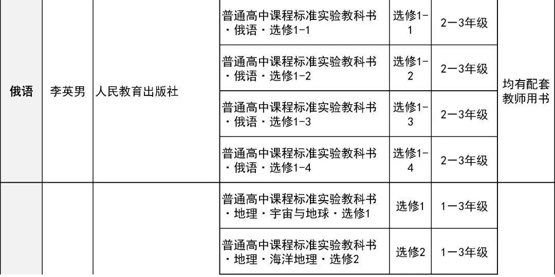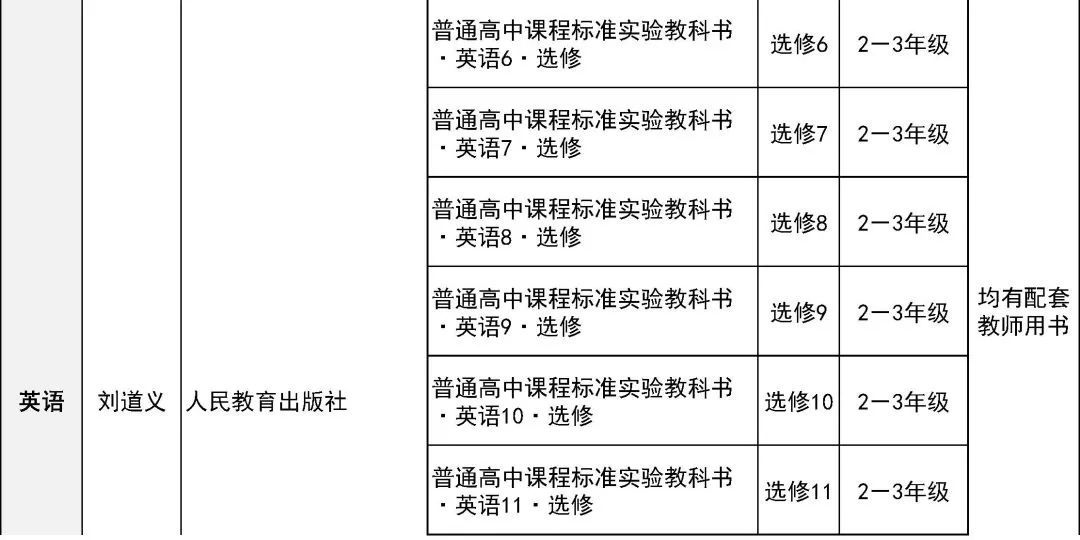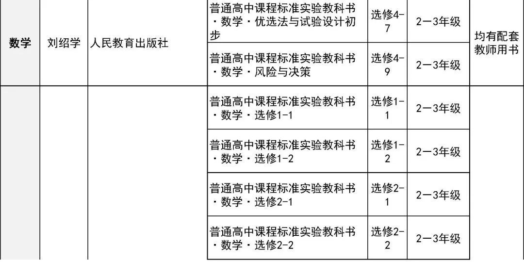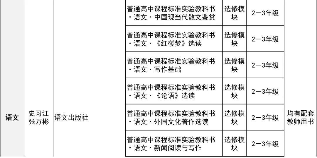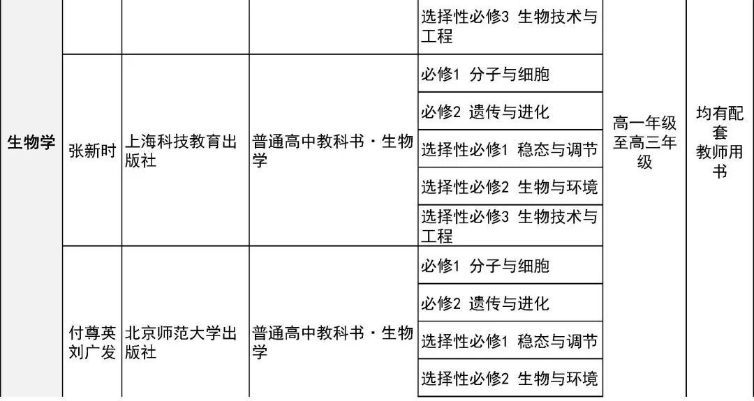 2、使用新教材的普通高中,各学科必修、选择性必修课程使用《2023年普通高中国家课程教学用书目录(根据2017年版课程标准修订)》中的教材。选修课程属于校本课程,由各省份按照《中小学教材管理办法》有关规定以及普通高中课程方案、课程标准要求确定教学材料的使用。