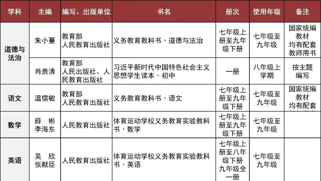 2、体育运动学校道德与法治、语文使用国家统编教材,其他学科使用《2023年体育运动学校国家课程教学用书目录》中的教材,或根据教学实际,选择《2023年义务教育国家课程教学用书目录》中的教材。