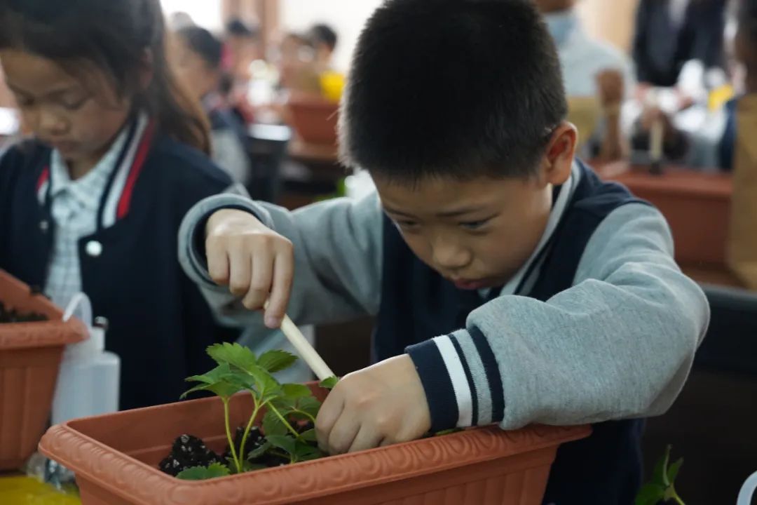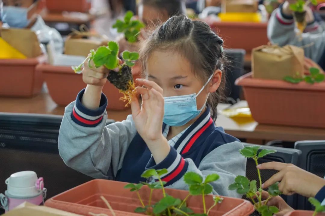 “我第一次体验种草莓,觉得很好玩。”学生陈李璇一边理着草莓苗的根部一边说。“我今天学到了草莓种植知识,还亲手种下一盆草莓,期待草莓苗能早日开花结果。”捧着花盆的龙星瑜充满了期待。