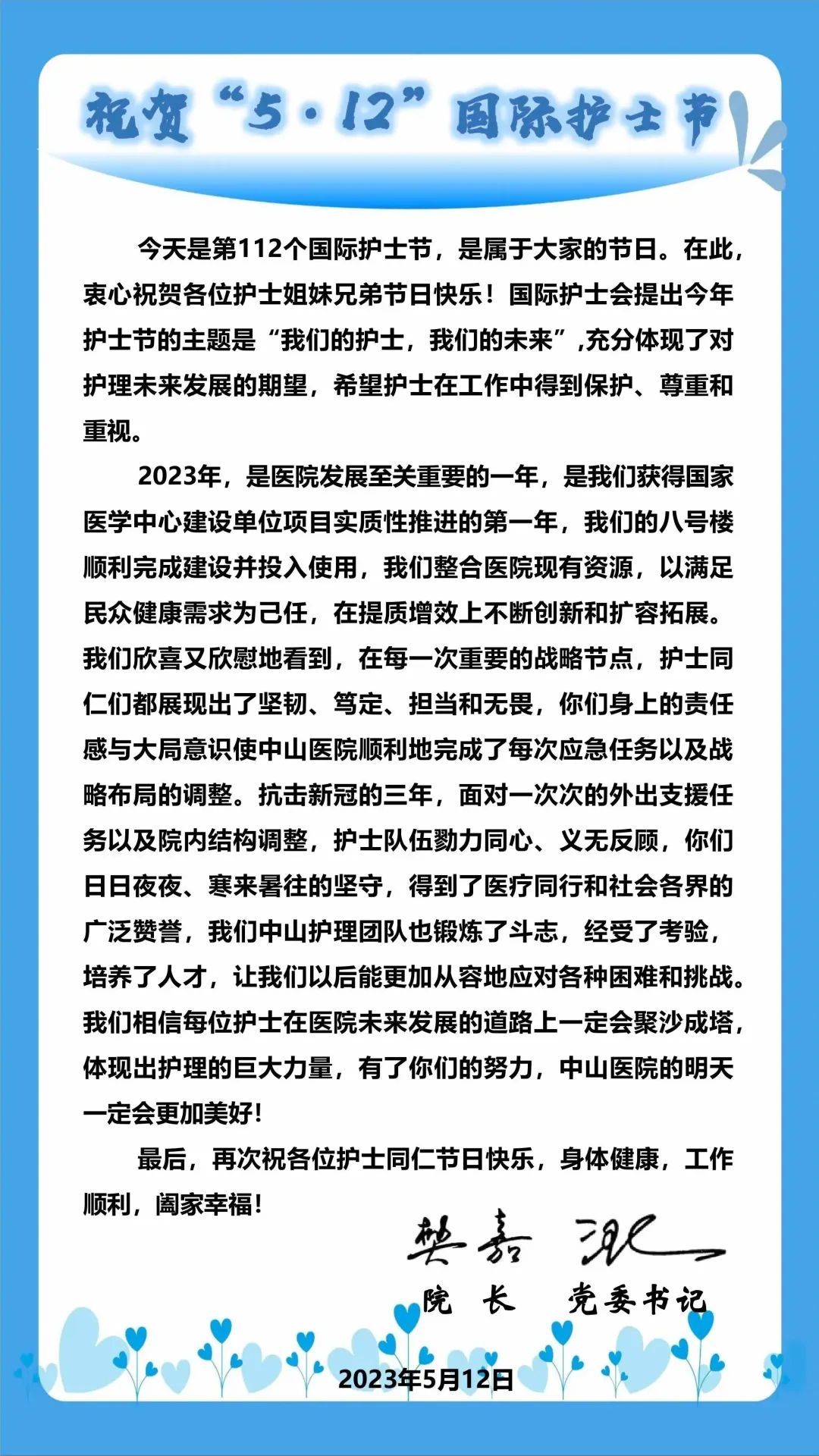 中国科学院院士、复旦大学附属中山医院院长樊嘉代表医院领导班子向2250名奋战在各个岗位上的护理工作者表达诚挚的问候。他表示,医院会继续关心和支持每一位护士,希望大家在医院的新发展阶段,为医院的美好未来,为广大患者做出更大贡献。