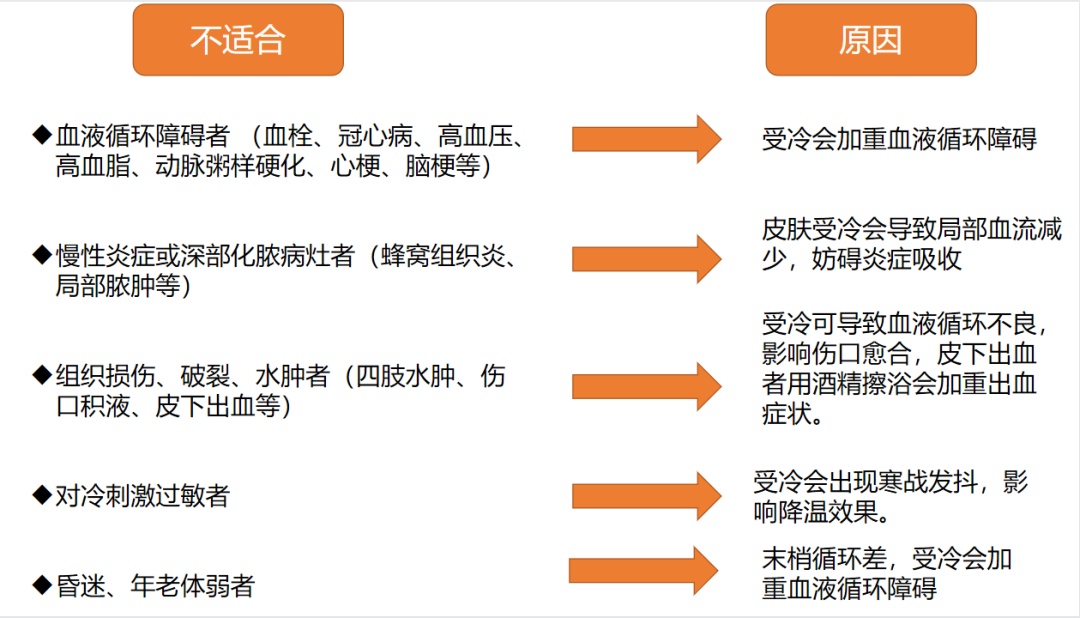 注意:然而并不是所有人都可以用物理降温的方式的。由下图我们可以看到哪些人不适合及其原因。