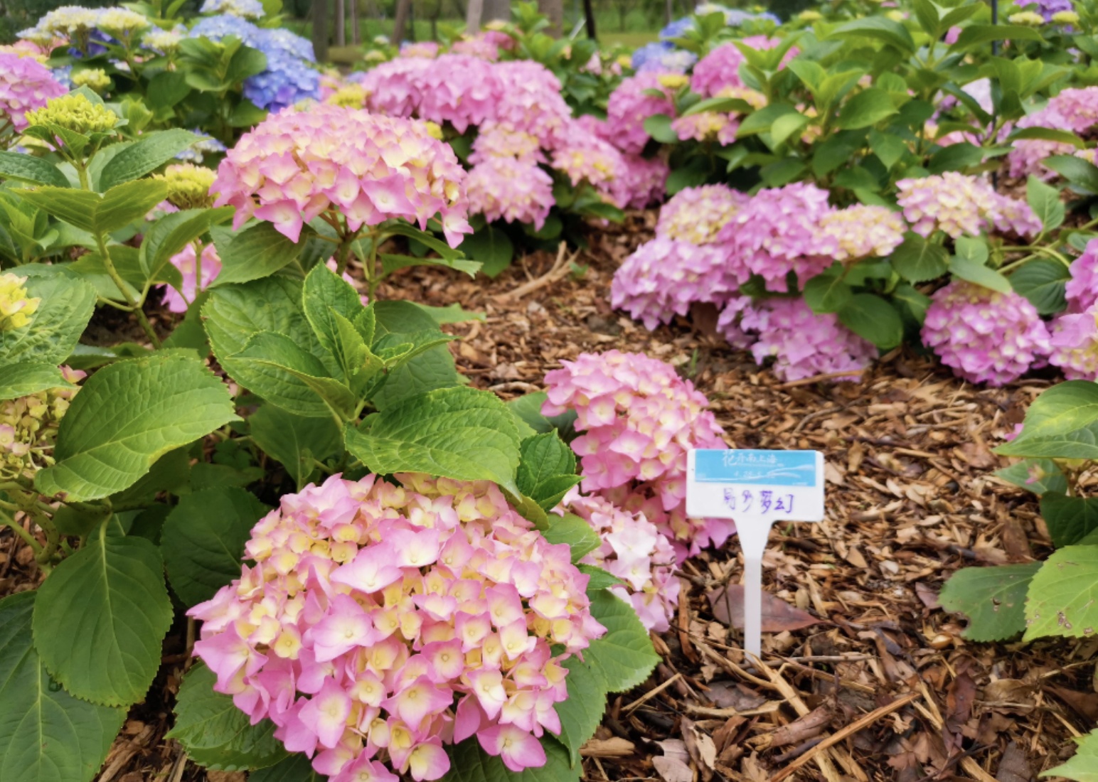 此次奉贤区全域花展以绣球为主题花,在全区种植约5万平方米,总数约10万余株。据花展工作人员梁雪钰介绍,本次花展专门划分出“锦绣花坡”区域,包含4个半圆形展示区,每个展示区大概有400平方米,集中科普展示来自各个国家不同区域的绣球品种。色彩鲜艳、枝干饱满的欧洲绣球热情奔放,蓝色静谧、小巧精致的日本绣球小家碧玉,色彩丰富多样、花开繁密的中国绣球“易多梦幻”花如其名,老枝新枝都能开花的美国绣球则代表了“无尽的夏天”。