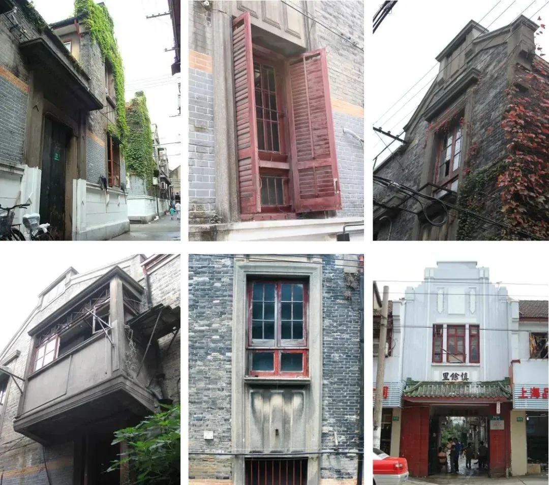 ▲慎余里的建筑立面特征:石库门头、木窗百叶、山墙压顶、阳台、水刷石统长窗套、骑楼