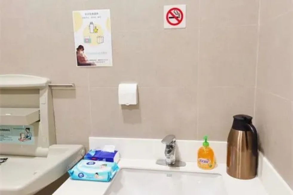 考虑到出行的宝妈冲泡奶粉和应急需要,车站贴心地准备了热水、湿巾、一次性尿布等应急物品。