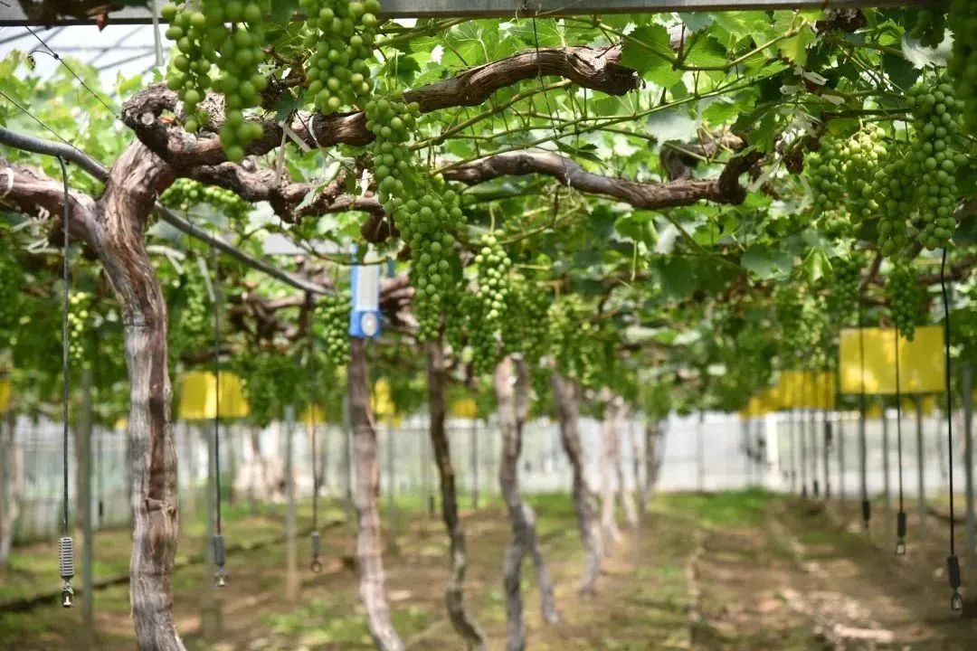 在上海马陆葡萄研究所的种植大棚内,一串串晶莹剔透的葡萄挂在枝头,有的紫如玛瑙,有的青如碧玉,部分品种正处于上色关键期。