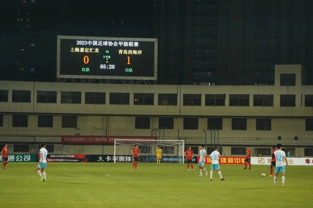 易边再战,客队攻势不减。第65分钟,青岛西海岸队员拉尼尔禁区前沿远射攻门,球打在嘉定汇龙防守队员身上发生变线,门将反应不及,场上比分变为0-1,客队取得领先。一球落后的上海嘉定汇龙保持了顽强拼搏的精神,多次创造反击机会,但无奈未能转化为进球。
