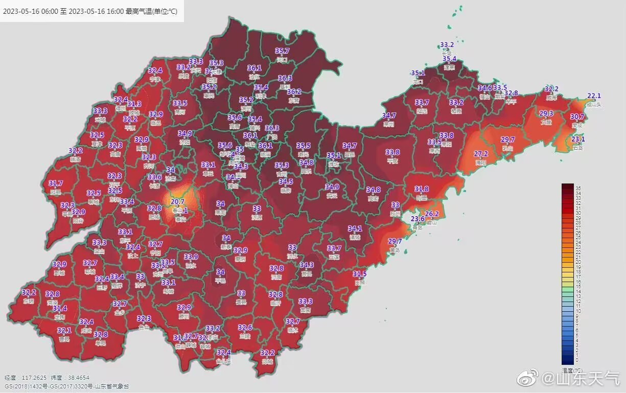 5月16日,山东省高温天气持续,但与昨天相比,热力明显降级。记者从省气象台了解到,根据全省大监站监测情况,共有20个县(区、市)气温超过35度,最高温为36.3度。预计17日,鲁西北和鲁中的部分地区仍将出现35℃以上高温天气,省气象台16日16时继续发布高温黄色预警。
